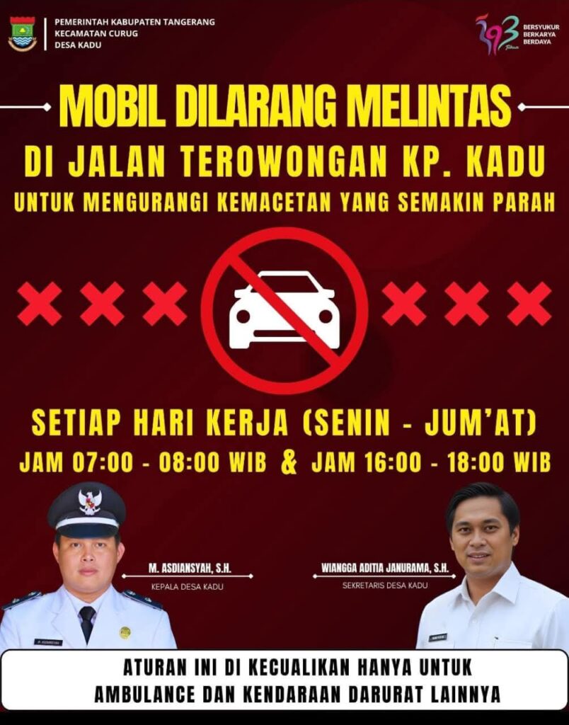 Bidikrealita.com, TANGERANG –Dalam upaya mengatasi mengatasi dan mengurangi kemacetan yang kerap terjadi pada waktu pagi dan sore hari, Pemerintah Desa Kadu mulai menerapkan aturan pembatasan bagi kendaraan roda empat dilarang melintas di Jalan Terowongan Kampung Kadu pada jam berangkat-pulang kerja, yaitu pagi dan sore hari.