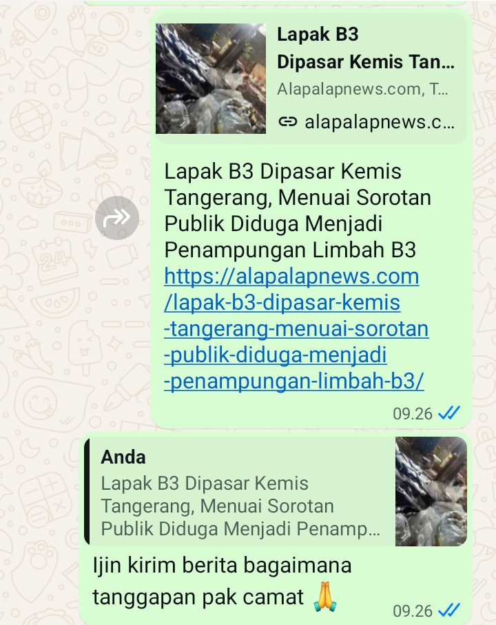 Saat kami konfirmasi ke nurhanudin selaku camat pasar Kemis via pesan singkat WhatsApp, Diduga camat tersebut bungkam seribu bahasa, kamis (20/11)