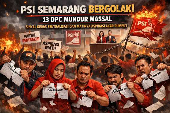 SEMARANG | Bidikrealita.com – Retaknya soliditas internal Partai Solidaritas Indonesia (PSI) Kota Semarang akhirnya pecah ke ruang publik. Puluhan pengurus dari 13 Dewan Pimpinan Cabang (DPC) memilih mundur massal pada Minggu (22/2) malam. Tak sekadar melepas jabatan, sebagian bahkan mengembalikan atribut partai berupa papan nama (plang) ke kantor Dewan Pimpinan Daerah (DPD) PSI Kota Semarang—sebuah