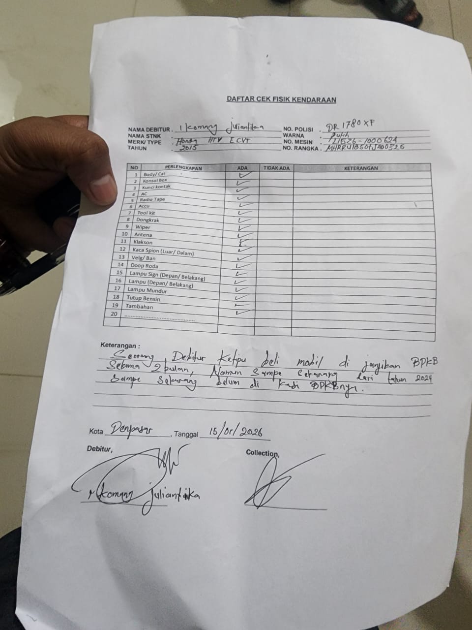 Ironisnya, dalam selembar kertas surat pengembalian itu, hanya ber-kop surat DAFTAR CEK FISIK KENDARAAN dan tidak ada nama penerima, hanya tandatangan, kop surat tidak, stempel dari faince tidak ada Jum’at (16/1/26)
